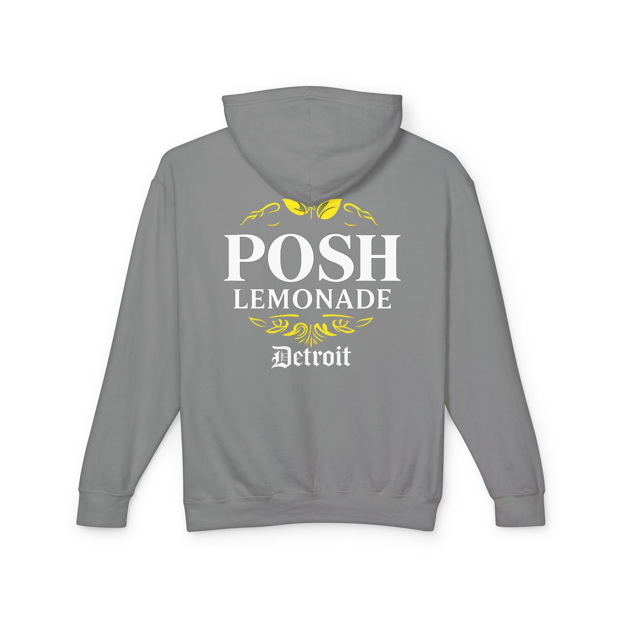 A soft, light hoodie that carries Detroit pride with vintage grit and neighborhood charm. The front shows a bold, street-style graphic—skyline, classic muscle car, and lightning accents—framed by the rallying line “Make America Detroit Again.” The back eases into a refined label-style print reading “Posh Lemonade” with subtle lemon motifs, blending urban edge with a playful, local twist. Wear it on cool mornings walking through your block, at pop-up markets, or when you want to rep the Motor City with personality. The relaxed cut and jersey-lined hood keep movement easy and layering comfortable, while the natural cream tone lets the yellow-and-charcoal artwork pop without shouting. This hoodie feels lived-in from the first wear—soft, breathable, and quietly proud.