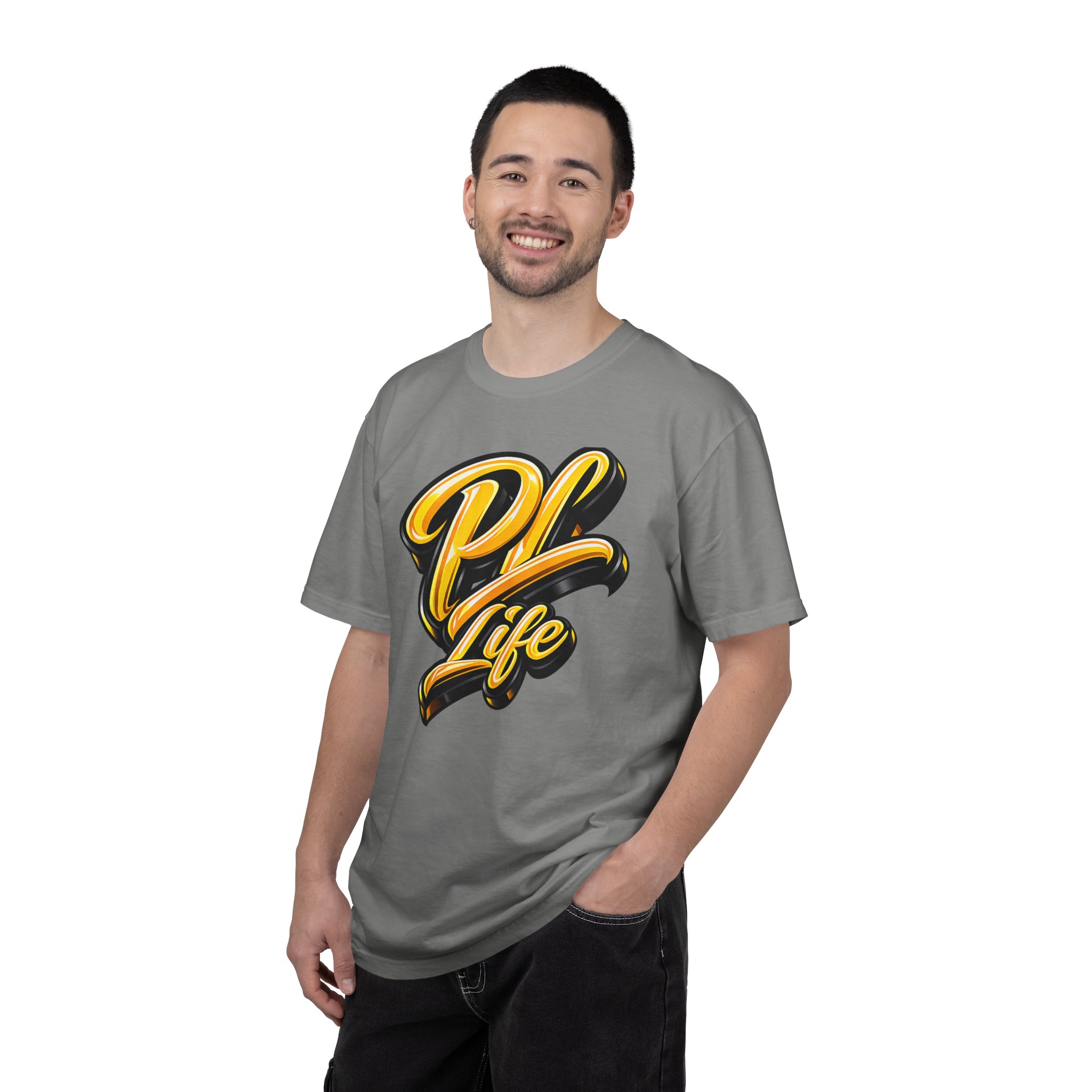 This heavyweight garment-dyed tee carries bold, streetwise energy—soft to the touch but loud in presence. Front and back graphics wrap the shirt in a confident, golden script: the chest features an artful “PH Life” emblem, while the back announces a playful, money-smart slogan in three-dimensional lettering. The relaxed silhouette and pre-shrunk ring-spun cotton make it comfortable for long days out, studio sessions, or cruising the neighborhood. Wear it with worn denim and high-tops for a laid-back look that reads like a personal motto. The garment-dyed finish gives a lived-in color and texture that only improves with time, turning the tee into something you reach for again and again.